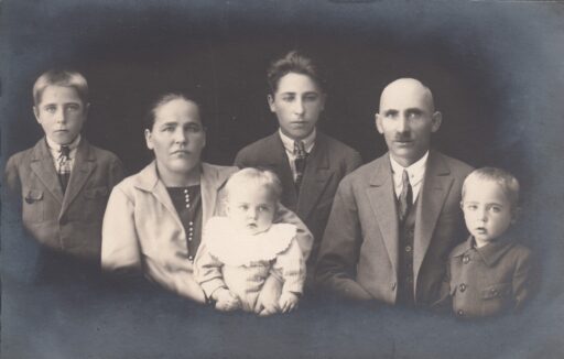 Yrjö Mäkelän perhe Orismalasta noin v. 1926-1927. Vas. Paavo, Okahvie, sylissä Ville, Jussi, Yrjö ja Pekka. Lähde: Sampo-tietokanta, KSS